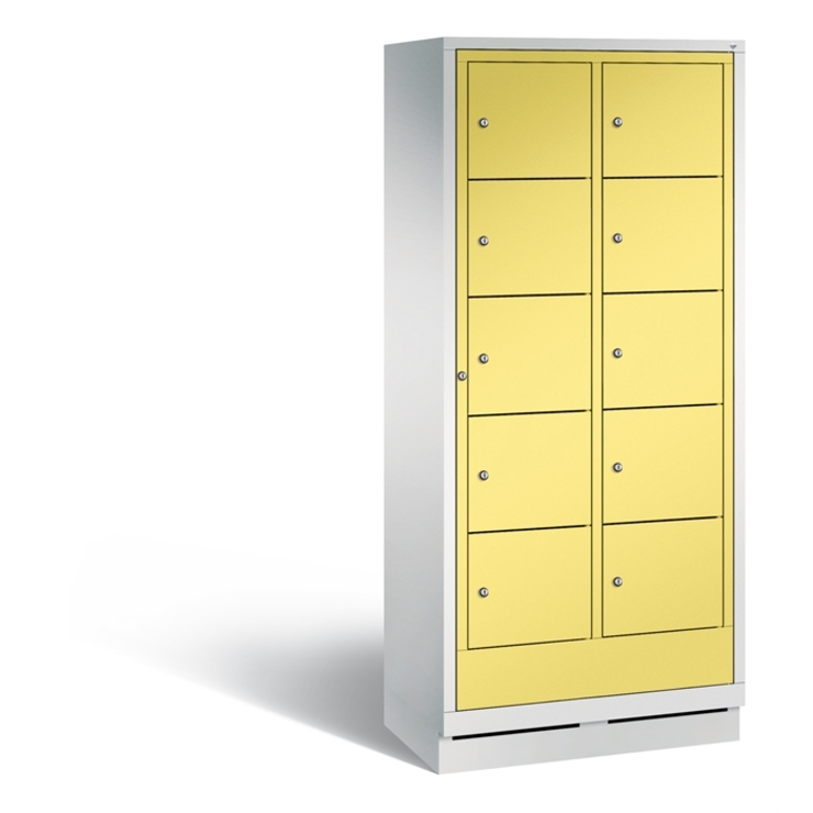 Stahl-Wäsche-Ausgabeschrank Evolo, als Wäsche-Ausgabeschrank, 2 Abteile mit je 5 Fächern, Korpus aus stabiler Stahlkonstruktion mit hochwertiger Einbrennbeschichtung für hohe UV- und Korrosionsbeständigkeit, mit 5 einzel verschließbaren Fachtüren und Zentraltür mit der alle Gefache zentral geöffnet werden (z.B. zum Befüllen), Schrankboden und Rückwand hinten mit Lüftungsöffnungen für optimale Luftzirkulation, auf 100 mm hohem Sockel, mit Kunststoffgleitern als praktischer Schrank- und Fußbodenschutz, vorne zurückgesetzt und oberhalb mit Luftdurchlass, 10 Zylinderschlösser mit je 2 Schlüsseln, Schließkreis bis 1000 verschiedene Schließungen, 1 Zylinderschloss mit 2 Schlüsseln, Schließkreis bis 1000 verschiedene Schließungen, Maße (H x B x T): 1800 x 810 x 500 mm, Korpus: RAL 7035 Lichtgrau, Türen Stahl: 0959059 RDS Schwefelgelb