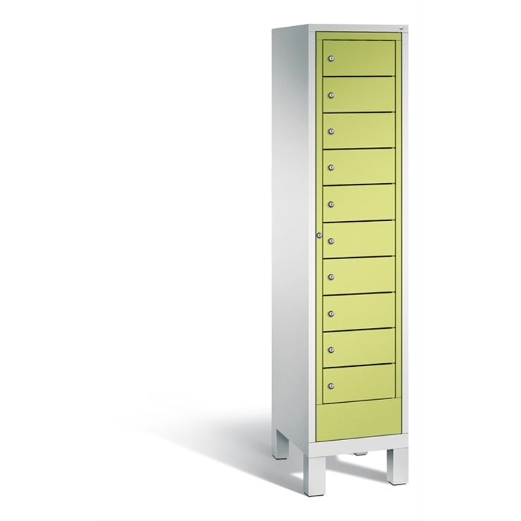 Stahl-Wäsche-Ausgabeschrank Evolo, als Wäsche-Sammelschrank, 1 Abteil mit 10 Fächern, Korpus aus stabiler Stahlkonstruktion mit hochwertiger Einbrennbeschichtung für hohe UV- und Korrosionsbeständigkeit, mit 10 einzel verschließbaren Fachtüren und Zentraltür mit der alle Gefache zentral geöffnet werden (z.B. zum Befüllen), Schrankboden und Rückwand hinten mit Lüftungsöffnungen für optimale Luftzirkulation, auf 150 mm hohen Füßen aus Kunststoff, mit integrierter Niveauregulierung und Schutzhülsen zur stilvollen Abdeckung der Verstellschrauben, bequem von innen und außen verstellbar, 10 Zylinderschlösser mit je 2 Schlüsseln, Schließkreis bis 1000 verschiedene Schließungen, 1 Zylinderschloss mit 2 Schlüsseln, Schließkreis bis 1000 verschiedene Schließungen, Maße (H x B x T): 1850 x 420 x 500 mm, Korpus: RAL 7035 Lichtgrau, Türen Stahl: 1108060 RDS Viridingrün, Füße: RAL 7035 Lichtgrau