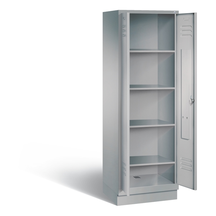 Stahl-Garderobenschrank Evolo, als Mehrzweckschrank, Korpus aus stabiler Stahlkonstruktion mit hochwertiger Einbrennbeschichtung für hohe UV- und Korrosionsbeständigkeit, Türen zueinanderschlagend für gemeinsamen Verschluss über 3-Riegel, innen 4 Einlegeböden, Schrankboden hinten mit Belüftungsöffnungen, auf 100 mm hohem Sockel, mit Kunststoffgleitern als praktischer Schrank- und Fußbodenschutz, vorne zurückgesetzt, 1 Ergonomischer Sicherheits-Drehriegel für Vorhangschloss inkl.... (mehr)? Papersmart hilft Ihnen, den besten Anbieter für Ihren gesamten Warenkorb zu ermitteln.