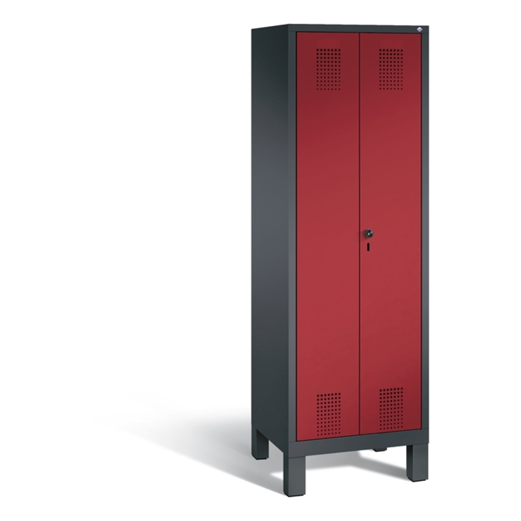 Stahl-Garderobenschrank Evolo, als Mehrzweckschrank, Korpus aus stabiler Stahlkonstruktion mit hochwertiger Einbrennbeschichtung für hohe UV- und Korrosionsbeständigkeit, Türen zueinanderschlagend für gemeinsamen Verschluss, innen mit Mitteltrennwand, je Abteil 4 Einlegeböden, Schrankboden hinten mit Belüftungsöffnungen, auf 150 mm hohen Füßen aus Kunststoff für erweiterten Korrosionsschutz, mit integrierter Niveauregulierung und Schutzhülsen zur stilvollen Abdeckung der Verstellschrauben, bequem von innen und außen verstellbar, 1 Ergonomischer Sicherheits-Drehriegel für Vorhangschloss inkl. Tür-Schutz, Türen mit Anschlagsdämpfer und geschlossenen Seitenprofilen für höchste Stabilität und Einbruchsicherheit, mit reinigungsfreundlichem Belüftungslochbild oben und unten sowie eingeprägtem Etikettenrahmen, Türaufhängung in Drehbolzen, Maße (H x B x T): 1850 x 610 x 500 mm, Korpus: RAL 7021 Schwarzgrau, Türen Stahl: RAL 3003 Rubinrot, Füße: RAL 9005 Tiefschwarz, Inneneinrichtung: RAL 7021 Schwarzgrau
