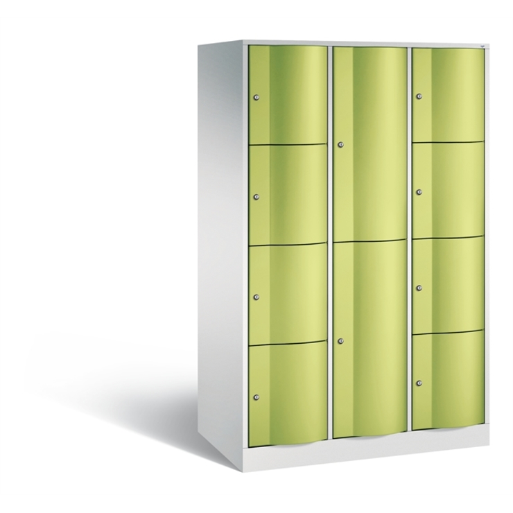 Stahl-Kombinations-Schließfachschrank Resisto, XL, 3 Abteile, Korpus aus stabiler Stahlkonstruktion mit hochwertiger Einbrennbeschichtung für hohe UV- und Korrosionsbeständigkeit, linkes und rechtes Abteil mit je 4 Fächern. Mittleres Abteil mit 2 Fächern, innen je Fach 1 stabile Garderobenstange aus Ovalprofil mit 3 verdrehsicheren Schiebehaken. Spezialtüren aus 1,5 mm Stahl, mit Wölbung nach vorne, absolut stabil und vandalismussicher, Türaufhängung durchgängig mit robustem Drehstangen-Scharnier, rechts angeschlagen, auf 100 mm hohem Sockel mit 30 mm Niveauregulierung, Rückwand mit großflächigem Luftdurchlass und 18 mm Wandabstandshaltern, 10 Drehzylinderschlösser mit 2 Schlüsseln, Schließkreis bis 6000 verschiedene Schließungen, Maße (H x B x T): 1950 x 1148 x 640 mm, Korpus: RAL 7035 Lichtgrau, Türen: 1108060 RDS Viridingrün