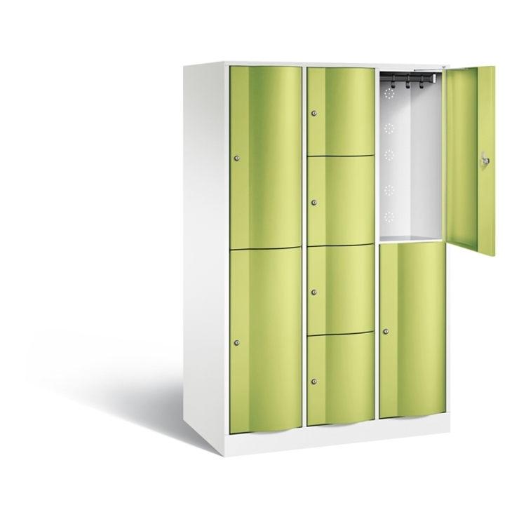 Stahl-Kombinations-Schließfachschrank Resisto, XL, 3 Abteile, Korpus aus stabiler Stahlkonstruktion mit hochwertiger Einbrennbeschichtung für hohe UV- und Korrosionsbeständigkeit, linkes und rechtes Abteil mit je 2 Fächern, innen je Fach 1 stabile Garderobenstange aus Ovalprofil mit 3 verdrehsicheren Schiebehaken. Mittleres Abteil mit 4 Fächern. Spezialtüren aus 1,5 mm Stahl, mit Wölbung nach vorne, absolut stabil und vandalismussicher, Türaufhängung durchgängig mit robustem Drehstangen-Scharnier, rechts angeschlagen, auf 100 mm hohem Sockel mit 30 mm Niveauregulierung, Rückwand mit großflächigem Luftdurchlass und 18 mm Wandabstandshaltern, 8 Drehzylinderschlösser mit 2 Schlüsseln, Schließkreis bis 6000 verschiedene Schließungen, Maße (H x B x T): 1950 x 1148 x 640 mm, Korpus: RAL 9016 Verkehrsweiß, Türen: 1108060 RDS Viridingrün
