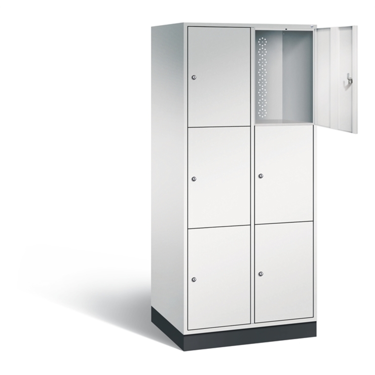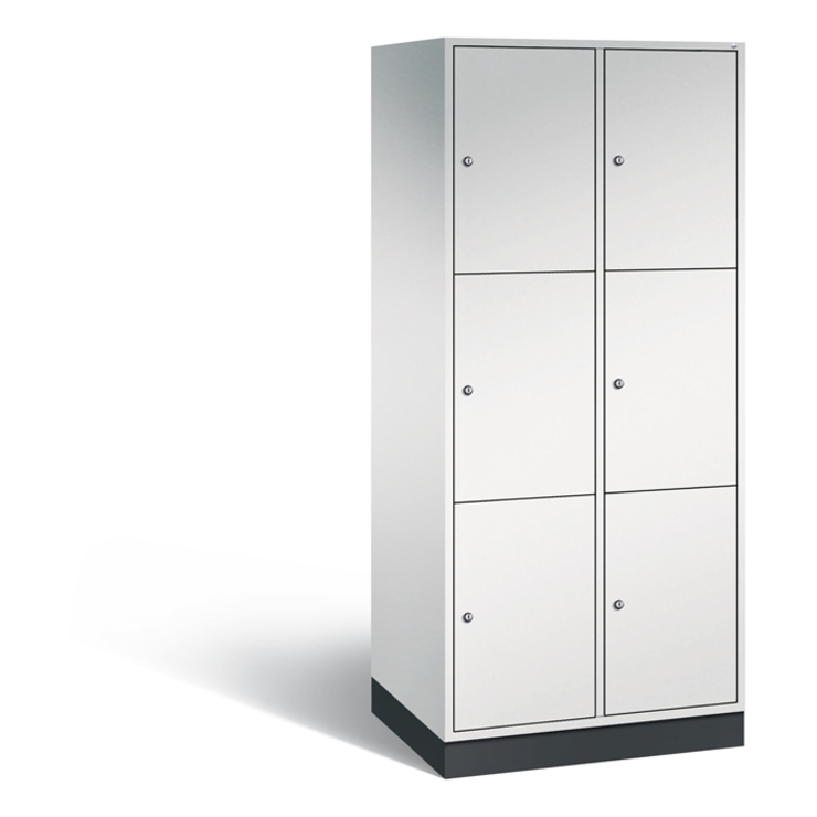 Stahl-Schließfachschrank Intro, XL, 2 Abteile mit 3 Fächern, Abteilbreite 400 mm, Korpus aus stabiler Stahlkonstruktion mit hochwertiger Einbrennbeschichtung für hohe UV- und Korrosionsbeständigkeit, Türen verstärkt für hohe Stabilität, mit Anschlagsdämpfer, Türaufhängung durchgängig mit robustem Scharnierband, rechts angeschlagen, Rückwand mit großflächigem Luftdurchlass und 18 mm Wandabstandshaltern, auf 100 mm hohem Sockel, 6 Zylinderschlösser mit je 2 Schlüsseln, Schließkreis bis 1000 verschiedene Schließungen, Maße (H x B x T): 1950 x 820 x 590 mm, Korpus: RAL 7035 Lichtgrau, Türen: RAL 7035 Lichtgrau, Sockel: RAL 7021 Schwarzgrau