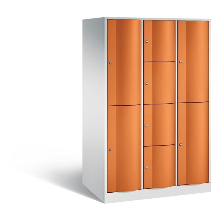 Stahl-Kombinations-Schließfachschrank Resisto, XXL, 3 Abteile, Korpus aus stabiler Stahlkonstruktion mit hochwertiger Einbrennbeschichtung für hohe UV- und Korrosionsbeständigkeit, linkes und rechtes Abteil mit je 2 Fächern, innen je Fach 1 stabile Garderobenstange aus Ovalprofil mit 3 verdrehsicheren Schiebehaken. Mittleres Abteil mit 4 Fächern. Spezialtüren aus 1,5 mm Stahl, mit Wölbung nach vorne, absolut stabil und vandalismussicher, Türaufhängung durchgängig mit robustem Drehstangen-Scharnier, rechts angeschlagen, auf 100 mm hohem Sockel mit 30 mm Niveauregulierung, Rückwand mit großflächigem Luftdurchlass und 18 mm Wandabstandshaltern, 8 Drehzylinderschlösser mit 2 Schlüsseln, Schließkreis bis 6000 verschiedene Schließungen, Maße (H x B x T): 1950 x 1148 x 740 mm, Korpus: RAL 7035 Lichtgrau, Türen: RAL 2000 Gelborange
