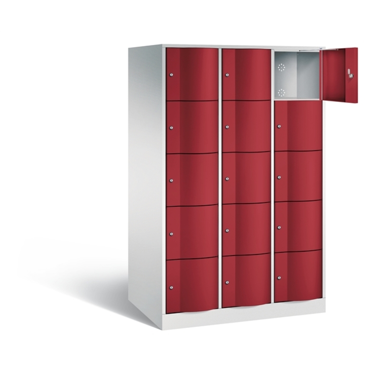 Stahl-Schließfachschrank Resisto, XXL, 3 Abteile mit je 5 Fächern, Korpus aus stabiler Stahlkonstruktion mit hochwertiger Einbrennbeschichtung für hohe UV- und Korrosionsbeständigkeit, Spezialtüren aus 1,5 mm Stahl, mit Wölbung nach vorne, absolut stabil und vandalismussicher, mit Anschlagsdämpfer, Türaufhängung durchgängig mit robustem Drehstangen- Scharnier, rechts angeschlagen, Rückwand mit großflächigem Luftdurchlass und 18 mm Wandabstandshaltern, auf 100 mm hohem Sockel mit 30 mm Niveauregulierung, 15 Drehzylinderschlösser mit 2 Schlüsseln, Schließkreis bis 6000 verschiedene Schließungen, Maße (H x B x T): 1950 x 1148 x 740 mm, Korpus: RAL 7035 Lichtgrau, Türen: RAL 3003 Rubinrot