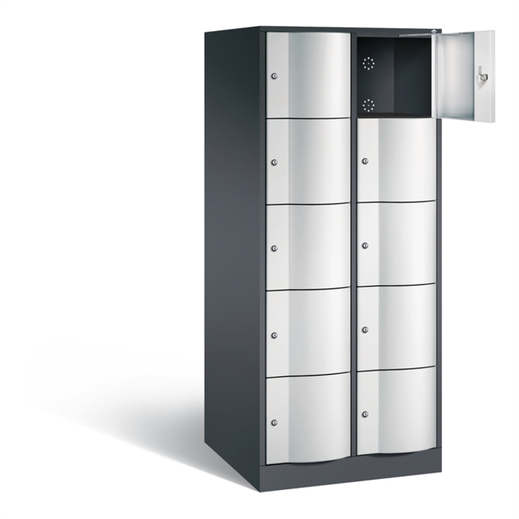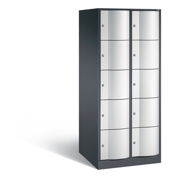 Stahl-Schließfachschrank Resisto, XXL, 2 Abteile mit je 5 Fächern, Korpus aus stabiler Stahlkonstruktion mit hochwertiger Einbrennbeschichtung für hohe UV- und Korrosionsbeständigkeit, Spezialtüren aus 1,5 mm Stahl, mit Wölbung nach vorne, absolut stabil und vandalismussicher, mit Anschlagsdämpfer, Türaufhängung durchgängig mit robustem Drehstangen- Scharnier, rechts angeschlagen, Rückwand mit großflächigem Luftdurchlass und 18 mm Wandabstandshaltern, auf 100 mm hohem Sockel mit 30 mm Niveauregulierung, 10 Drehzylinderschlösser mit 2 Schlüsseln, Schließkreis bis 6000 verschiedene Schließungen, Maße (H x B x T): 1950 x 772 x 740 mm, Korpus: RAL 7021 Schwarzgrau, Türen: RAL 7035 Lichtgrau