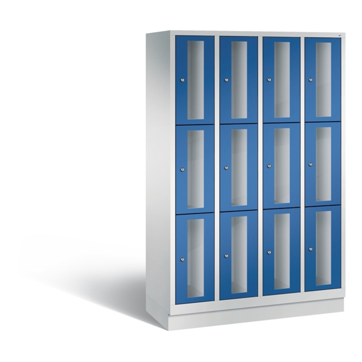 , Höhe: 1800 mm, Tiefe: 500 mm, Breite: 1190 mm, Fachhöhe: 510 mm, Innenhöhe: 510 mm, Innentiefe: 465 mm, Innenbreite: 230 mm, Sockelhöhe: 100 mm, Schrankhöhe: 1800 mm, Schranktiefe: 500 mm, Anzahl Türen: 12, Anzahl Fächer: 12, Materialstärke: 0.88 mm, Verschlussart: Zylinderschloss, Anzahl Schlüssel: 24, Öffnungswinkel der Türen: 110 °, Material: Stahlblech, Türfarbe: enzianblau RAL 5010, Anlieferung: montiert, Korpusfarbe: lichtgrau RAL 7035, Oberfläche: lackiert, Konstruktion: verschweißt, Ausführung Spindgestell: mit BodensockelStahl-Fächerschrank CLASSIC, Korpus aus stabiler Stahlkonstruktion mit hochwertiger Einbrennbeschichtung für hohe UV- und Korrosionsbeständigkeit auf 100 mm hohem Sockel, vorne zurückgesetzt, mit Kunststoff-Bodengleitern als Schrank- und Fußbodenschutz. Schließkreis bis 1000 verschiedene Schließungen. Türen mit Sichtfenster aus Acrylglas für direkten Einblick. Türaufhängung in Drehbolzen mit Öffnungswinkel von ca. 110°, inkl. Anschlagsdämpfer für angenehmes Schließverhalten.