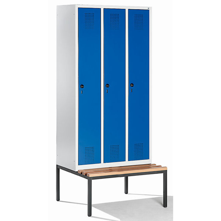 CP Garderobenschrank mit untergebauter Sitzbank - Abteilbreite 300 mm, HxBxT 2090 x 900 x 815 mm - lichtgrau / enzianblau