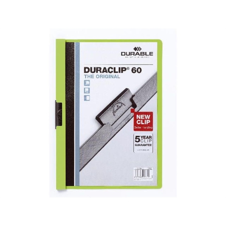 Klemm-Mappe DURACLIP® 60. Material und Farbe der Klemme: Spezialstahl, schwarz. Werkstoff: Hartfolie. Größe (B x H): 220 x 307 mm. Garantiedauer: 5 Jahre Clip Garantie. Verwendung für Papierformate: A4. Max. Aufbewahrungsmenge: 60 Blatt. Farbe der Vorderseite / Rückseite: transparent / grün.