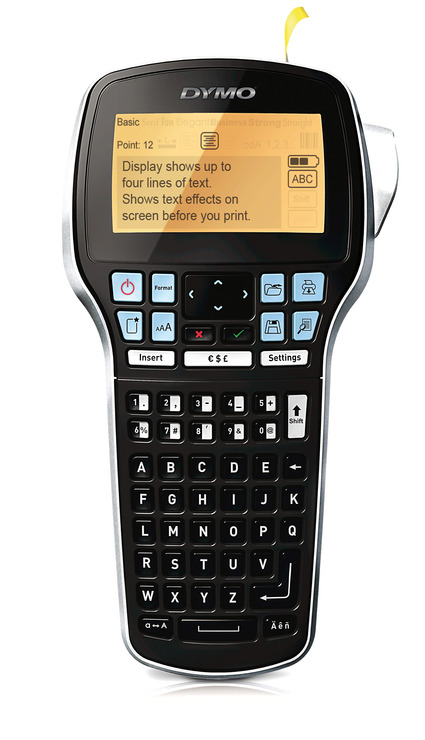 Beschriftungsgerät LabelManager 420P Etikettendrucker. Produktverwendung: Drucken von Etiketten. Für Bandtyp und -breite: Dymo D1 Bänder der Breiten 6 / 9 / 12 / 19 mm, 19 mm. Displayanzeige: großes Display, auf dem Sie die Texteffekte vor dem Druck sehen können mit Hintergrundbeleuchtung. Anzahl der Display-Zeilen: 4 Zeilen. Anzahl Schriftgrößen und Schriftstile: 7, 10. Art der Hilfenergie: Lithium-Ionen-Akku. Ausführung: Barcode-Druck möglich, Vertikaldruck möglich, Hintergrundmuster möglich, Unterstreichenfunktion vorhanden, 8 Umrahmungsstile. Ausstattung: 56 Tasten, Netzanschluss vorhanden. Schneidevorrichtung vorhanden. Max. Anzahl der Druckzeilen: 4. Speicher: 15-Etiketten-Speicher und Textspeicherungsfunktion. Lieferumfang: Paket enthält LabelManager 420P-Etikettendrucker, Litihum-Ionen-Akkusatz, Ladeadapter, D1-Starter-Etikettenkassette, Kurzanleitung und Garantiekarte. Größe (B x H x T): 104 x 215 x 57 mm. Garantie gewährt. Farbe: Schwarz.