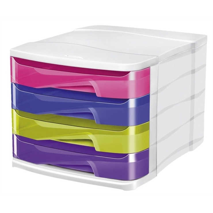 Die andere Schubladenbox. Geschwungene und gerade Linien machen sie elegant. An den Seiten und an den Schubladen werden Matt und Glanz kombiniert. Angeraute Oberfläche mit Vertiefung in “S”Form. Stapelsystem. Nehmen Dokumente bis 24 x 32 cm Kapazität bis zu 450 Blätter. Rutschfeste Gummifüßchen. Außenmaße (B x H x T): 292 x 246 x 386 mm. Material: bruchfestes glänzendes Polystyrol - 100% recycelbar.