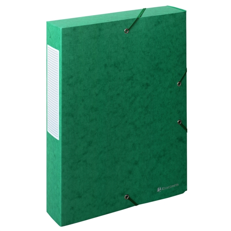 Archivbox Exabox Scotten. Max. Aufbewahrungsmenge: 500 Blatt. Mit 3 Klappen, Gummizügen und Rückenetikett, gerillte Oberfläche. Werkstoff: Manila-Karton. Verwendung für Papierformate: DIN A4. Größe (B x H x T): 240 x 320 x 60 mm. Farbe: grün. PEFC.
