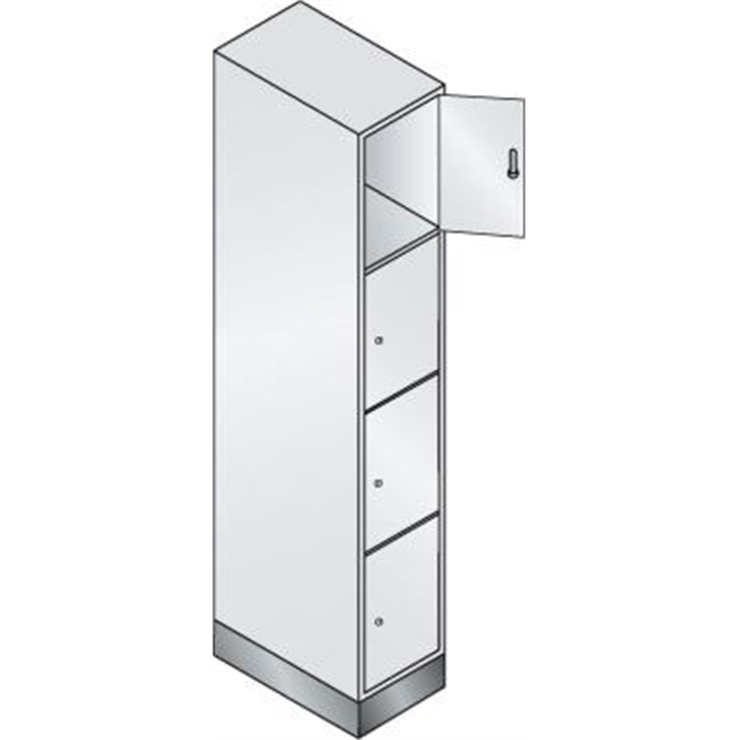 Fächerschrank mit Stahlblech-Sockel, teilverzinkt, 100 mm hoch (Gesamthöhe 1800 mm) • Viele Fächer auf kleinstem Raum Wahlweise mit 3, 4 oder 5 Fächern übereinander bei 1, 2, 3 oder 4 Abteilen nebeneinander. Lichte Fachmaße: B 230xT 465 mm. (B 330 mm auf Anfrage lieferbar.) • Langlebige Stahlblechkonstruktion Erhöhter Korrosionsschutz durch Schrankfüße aus Kunststoff. • Abschließbare Türen Schließung über Zylinderschlösser mit je 2 Schlüsseln. Rechts angeschlagen. Einwandige Ausführung mit glatter Oberfläche ohne Lochung und Etikettenrahmen. • Große Farbauswahl Korpus: RAL 7035 lichtgrau, Türen: RAL 7035 lichtgrau. Korpus: RAL 7035 lichtgrau, Türen: RAL 5010 enzianblau.