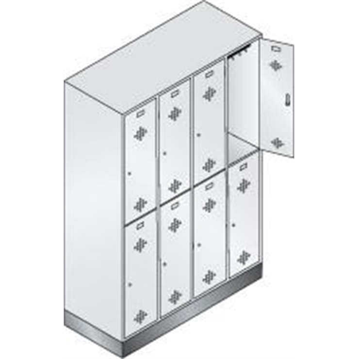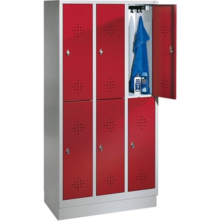 Doppelstöckiger Garderobenschrank Serie Classic mit 100 mm hohem Sockel, Höhe 1800 mm, lichtgrau/enzianblau • Langlebige Stahlblechkonstruktion Schränke mit 2 Fächern übereinander. Erhöhter Korrosionsschutz durch Schrankfüße aus Kunststoff. • Praktische Türen Rechts angeschlagen, in Drehbolzen gelagert, oben und unten mit je 1 Lochrosette und 1 eingestanztem Etikettenrahmen. Mit Drehriegelverschluss zur Verwendung eines Vorhängeschlosses. • Durchdachtes Innenkonzept Abteilbreite 400 mm, auf für Motorradhelme geeignet. Kleiderstange mit 3 Schiebehaken für jedes Abteil. Leichte Reinigung, glatt auskehrbarer Abteilboden. • Große Farbauswahl Korpus: RAL 7035 lichtgrau, Türen: RAL 7035 lichtgrau Korpus: RAL 7035 lichtgrau, Türen: RAL 5010 enzianblau Korpus: RAL 7035 lichtgrau, Türen: RAL 5012 lichtblau Weitere Farben auf Anfrage erhältlich. Böden und Fächer generell in Korpusfarbe ausgeführt. • Schranksockel: teilverzinkt, beschichtet in Gehäusefarbe. Abb. zeigt mögliche Farbkombination Korpus RAL 7035/Türen RAL 3003
