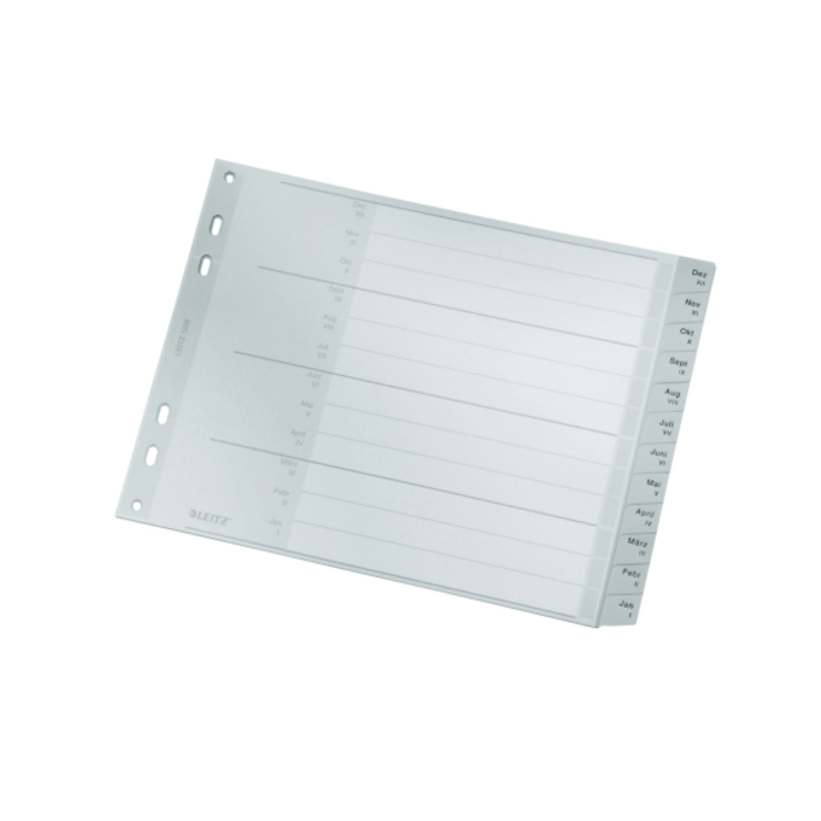 Leitz Register Monate, Plastik · Plastikregister mit beschriftbarem Deckblatt aus Karton und Taben mit Monatsaufdruck für ein schnelles Sortieren und Wiederfinden der Unterlagen. · Für Format A4 Überbreite, halbe Höhe. 12 Blatt Dez.-Jan. Maße 238 x 180 mm. PP-Folie. Farbe Grau. · Mit Überbreite zur Nutzung von Prospekthüllen · Beschriftbares Deckblatt aus Karton (250 g / m²) · 12 Blatt mit bedruckten Taben Dez.-Jan. zum schnellen Zugriff auf die Unterlagen · Mit Universal-Lochung · Stabile PP-Folie (0,12 mm) ·