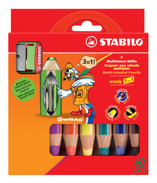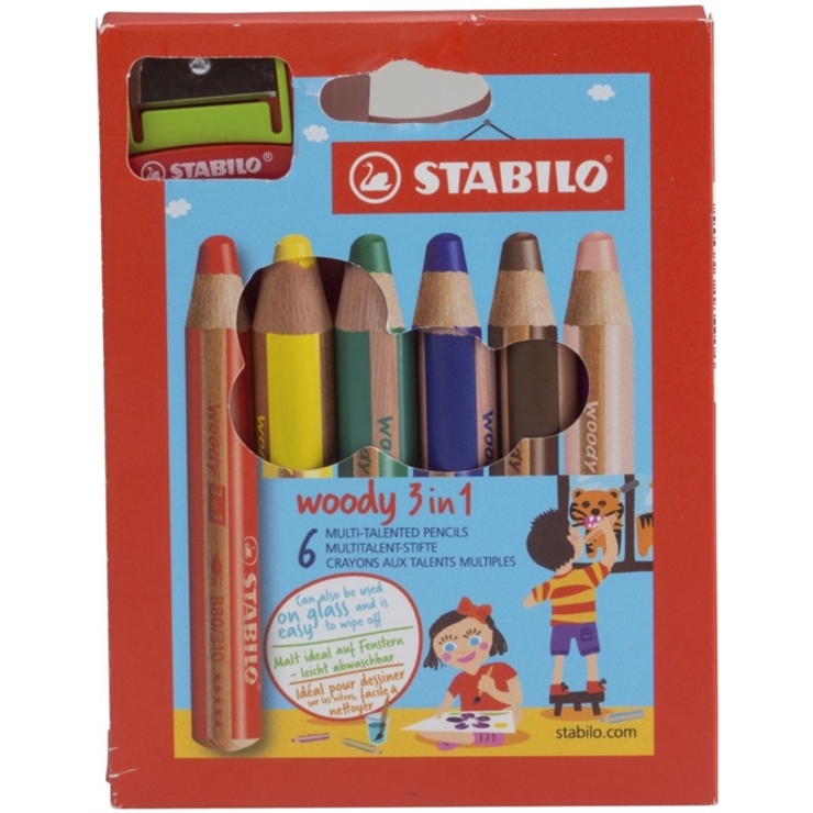 Multitalent-Stift STABILO® woody 3 in 1, Kartonetui mit 6 Stiften und 1 Spitzer