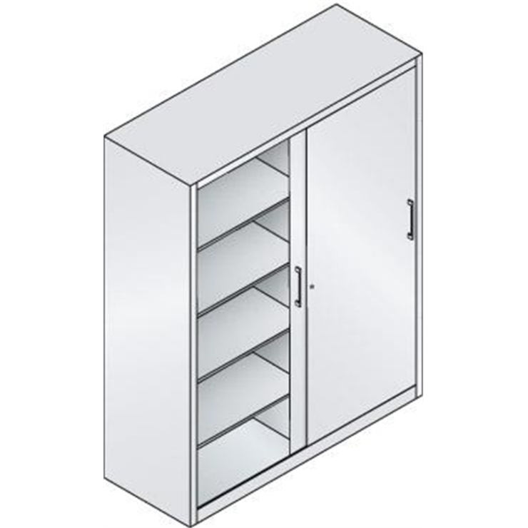 Werkzeugschrank mit Schiebetüren, Korpus RAL 7035, Türen RAL 5012 lichtblau Sauber verarbeitet Stabile Stahlblechkonstruktion, Höhe: 1950 mm. Dreh-Druckzylinderschloss inkl. 2 Schlüsseln. Ab Schrankbreite 1600 mm mit Mittelwand. Leichtgängige Schiebetüren Mit Spezial-Kugellagerrollen. In stabiler Kunststoff-Schienenführung. • Einlegeböden Verzinkt und verstellbar im 15-mm-Raster. 70 kg Tragkraft bei gleichmäßig verteilter Last.