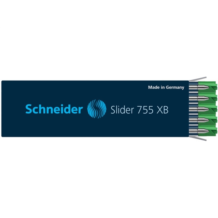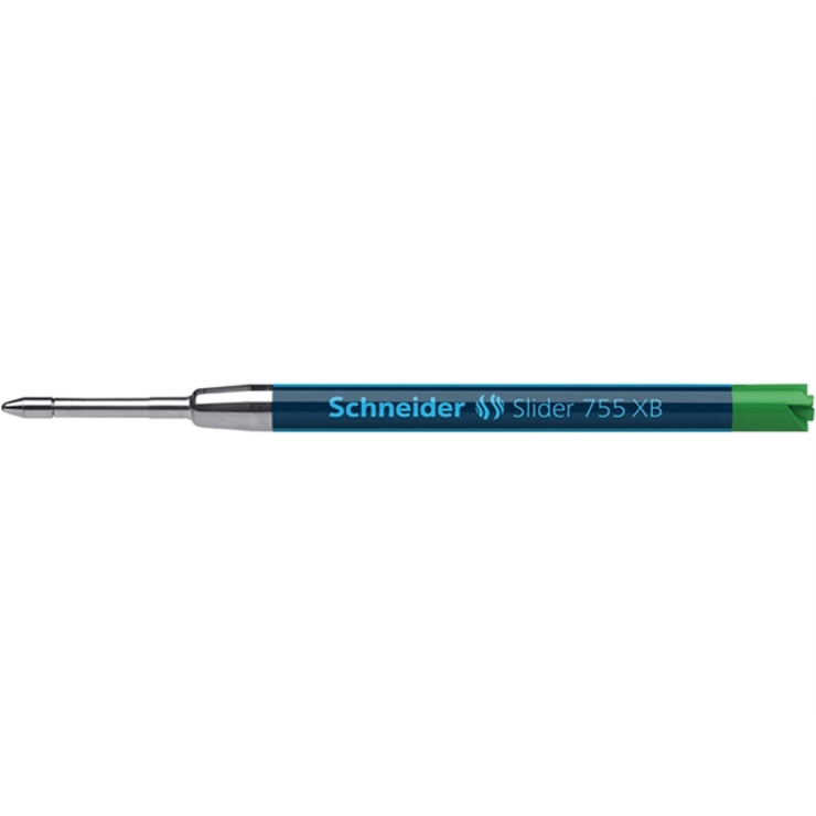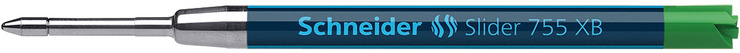 Kugelschreibermine Slider 755. Verwendung für Produkt: Passend in alle Schneider Kugelschreiber-Modelle und Gelschreiber mit universeller Passform "Plug & Play", sowie viele am Markt befindliche Kugelschreiber mit G2-System. Typbezeichnung der Mine: Internationale Großraummine im G2-Format mit revolutionärer ViscoGlide®-Technologie. Ausführung Mine: XB, grün, dokumentenecht. Typbezeichnung der Mine gemäß ISO-Norm: ISO 12757-2 G2. Material des Schaftes: Metallmine. Länge: 98 mm. Die verschleißfeste Edelstahlspitze garantiert, dass der große Pasteninhalt vollständig und schmierfrei genutzt werden kann.