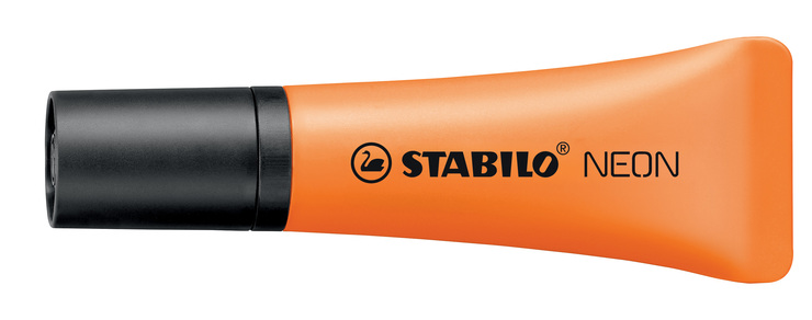 Textmarker STABILO® Neon. Schattenfrei kopierbar. Strichstärke: 2 + 5 mm. Art der Schreibflüssigkeit: Tinte auf Wasserbasis, lichtbeständig gegeben. Tintenspeicher-Technik: Kapillarspeicher. Stylisches minimalistisches Tubendesign im angesagten, sexy Neon-Look. Weiche Oberfläche für komfortable, angenehme Haltung. STABILO Anti-Dry-Out Technology: 4 Stunden Austrocknungsschutz für konzentriertes Arbeiten. Farbe des Schaftes: in Schreibfarbe. Farbe: orange.