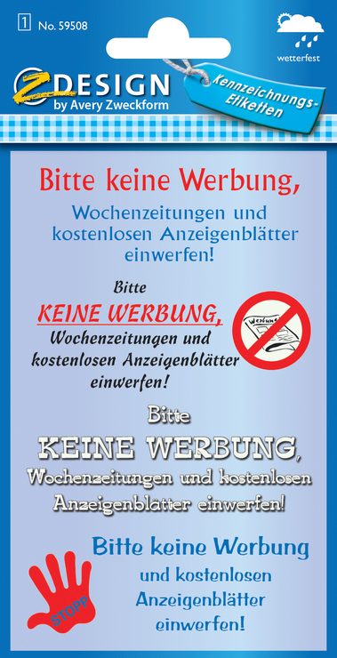 Sie haben zu viel Werbung im Briefkasten? Mit den Z-Design Hinweisetiketten ""Keine Werbung"" machen Sie am Briefkasten deutlich, dass Sie keine Werbesendungen annehmen möchten. Die wetterfesten Aufkleber gibt es in verschiedenen Designs, Farben und Materialien passend für jeden Briefkasten.